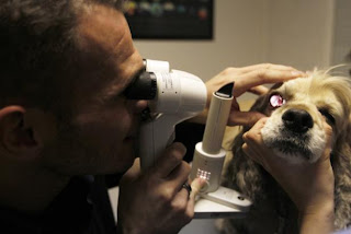(Un vétérinaire spécialisé en ophtalmologie, examine l'oeil d'un chien, le 30 novembre 2010 à la clinique à Paris. JOEL SAGET)